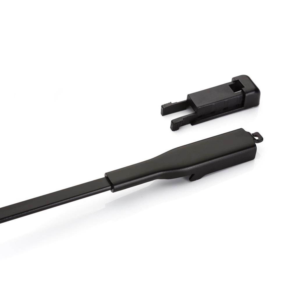 - Le caoutchouc d'essuie-glace est constitué d'un mélange à base de caoutchouc naturel additionné de graphite, ce qui améliore le coefficient de frottement et réduit le bruit de l'essuie-glace. Les bandes souples latérales sont en acier hautement résilient, recouvertes d'un revêtement plastique résistant aux rayons UV et aux intempéries (sels, acides, polluants des gaz d'échappement).