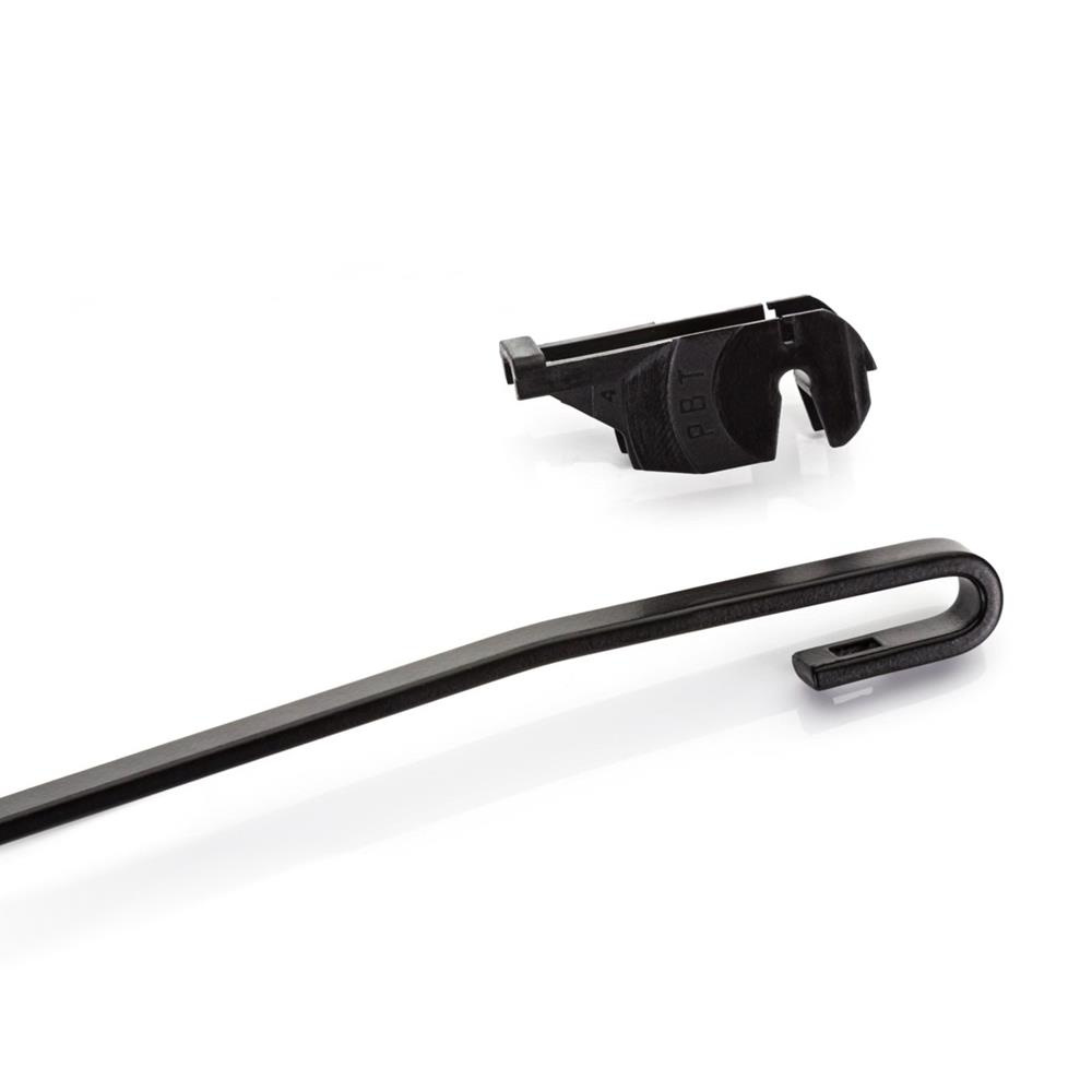 - Le caoutchouc d'essuie-glace est constitué d'un mélange à base de caoutchouc naturel additionné de graphite, ce qui améliore le coefficient de frottement et réduit le bruit de l'essuie-glace. Les bandes souples latérales sont en acier hautement résilient, recouvertes d'un revêtement plastique résistant aux rayons UV et aux intempéries (sels, acides, polluants des gaz d'échappement).