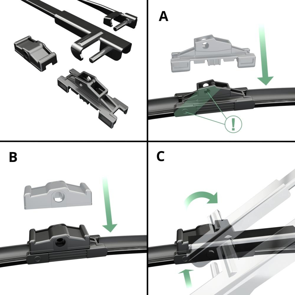 - adaptateurs (éléments utilisés pour relier le balai au bras d'essuie-glace): type type B \ type D .
