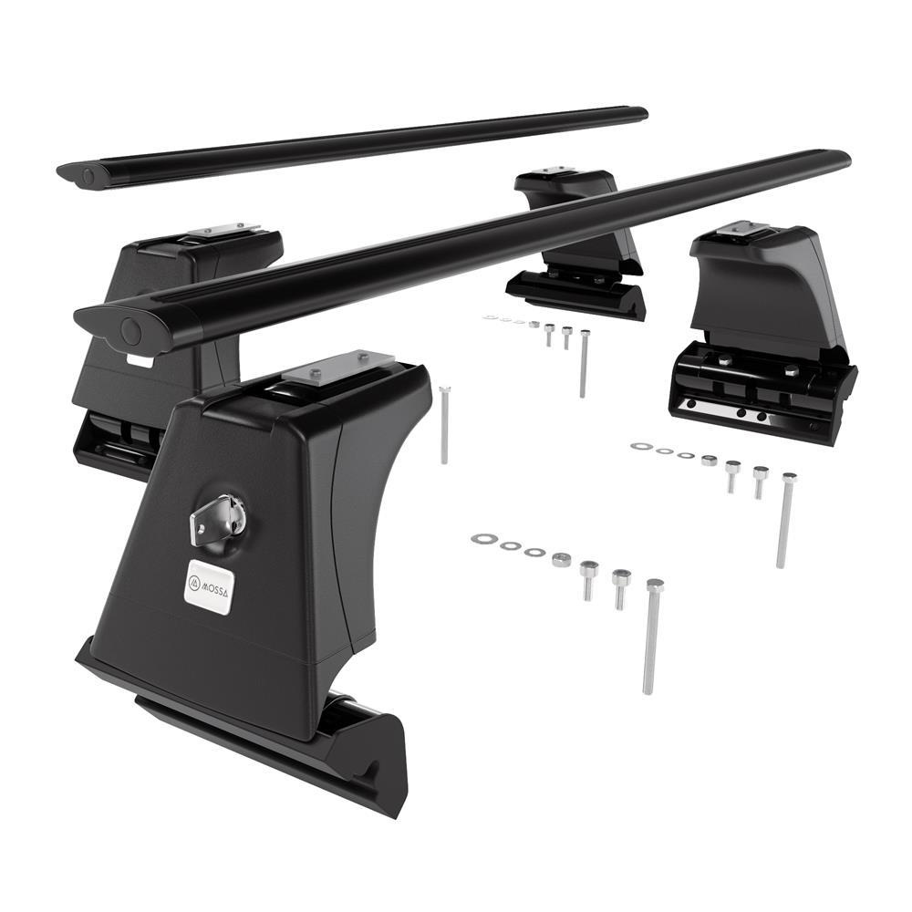 - Le kit de barres de toit se compose de 2 barres en aluminium solides ainsi que de 4 prises (appelé aussi patte), qui s’adaptent au type de toit ainsi qu’au modèle ou à la génération de la voiture sélectionnée.