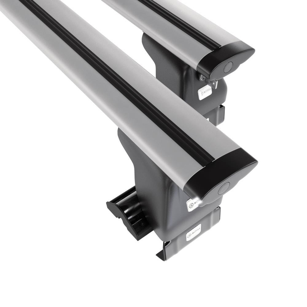 - Le kit de barres de toit se compose de 2 barres en aluminium solides ainsi que de 4 prises (appelé aussi patte), qui s’adaptent au type de toit ainsi qu’au modèle ou à la génération de la voiture sélectionnée.