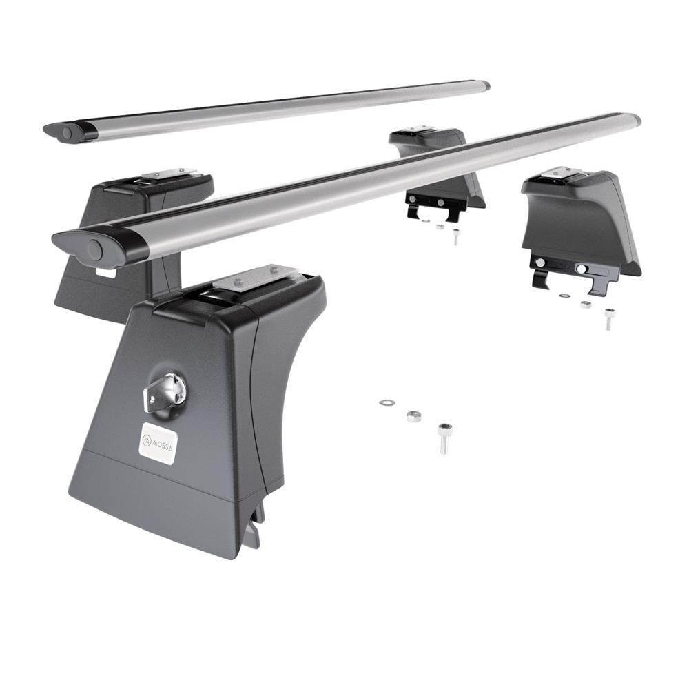 - Le kit de barres de toit se compose de 2 barres en aluminium solides ainsi que de 4 prises (appelé aussi patte), qui s’adaptent au type de toit ainsi qu’au modèle ou à la génération de la voiture sélectionnée.