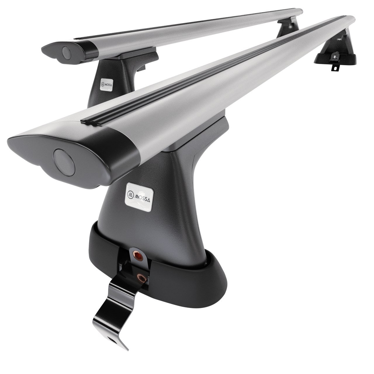 - Le kit de barres de toit se compose de 2 barres en aluminium solides ainsi que de 4 prises (appelé aussi patte), qui s’adaptent au type de toit ainsi qu’au modèle ou à la génération de la voiture sélectionnée.