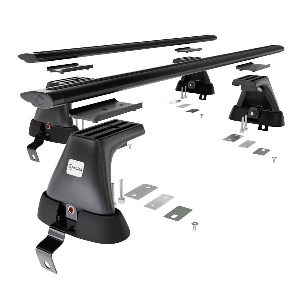 - Le kit de barres de toit se compose de 2 barres en aluminium solides ainsi que de 4 prises (appelé aussi patte), qui s’adaptent au type de toit ainsi qu’au modèle ou à la génération de la voiture sélectionnée.
