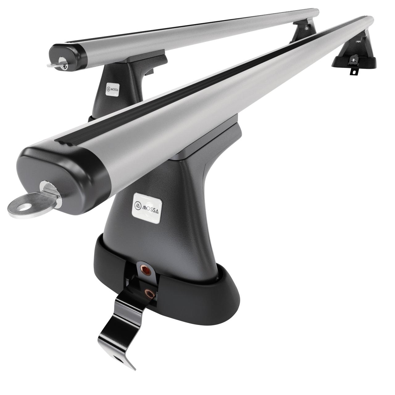 - Le kit de barres de toit se compose de 2 barres en aluminium solides ainsi que de 4 prises (appelé aussi patte), qui s’adaptent au type de toit ainsi qu’au modèle ou à la génération de la voiture sélectionnée.