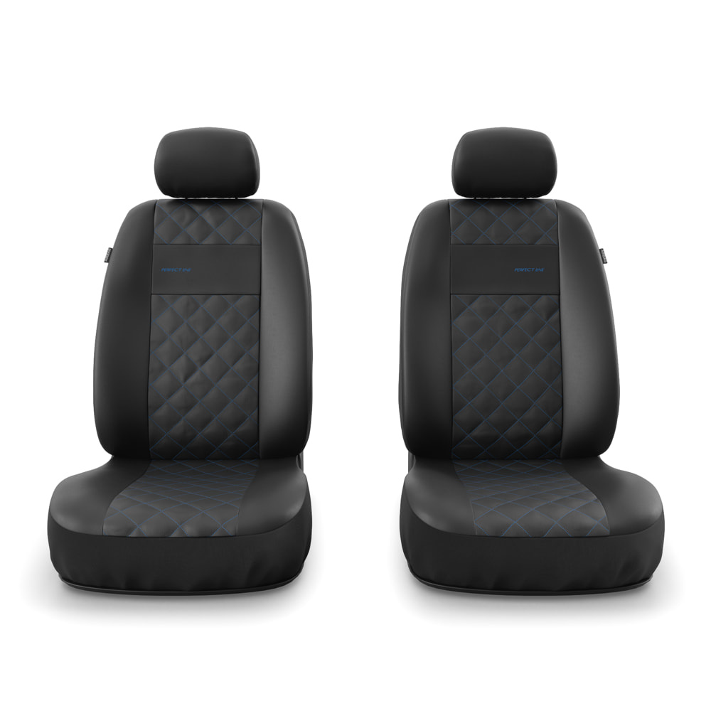 - Les housses sont en similicuir noir résistant et antitache, avec un matelassage décoratif au centre bleu. Les housses avant sont également ornées de broderies.