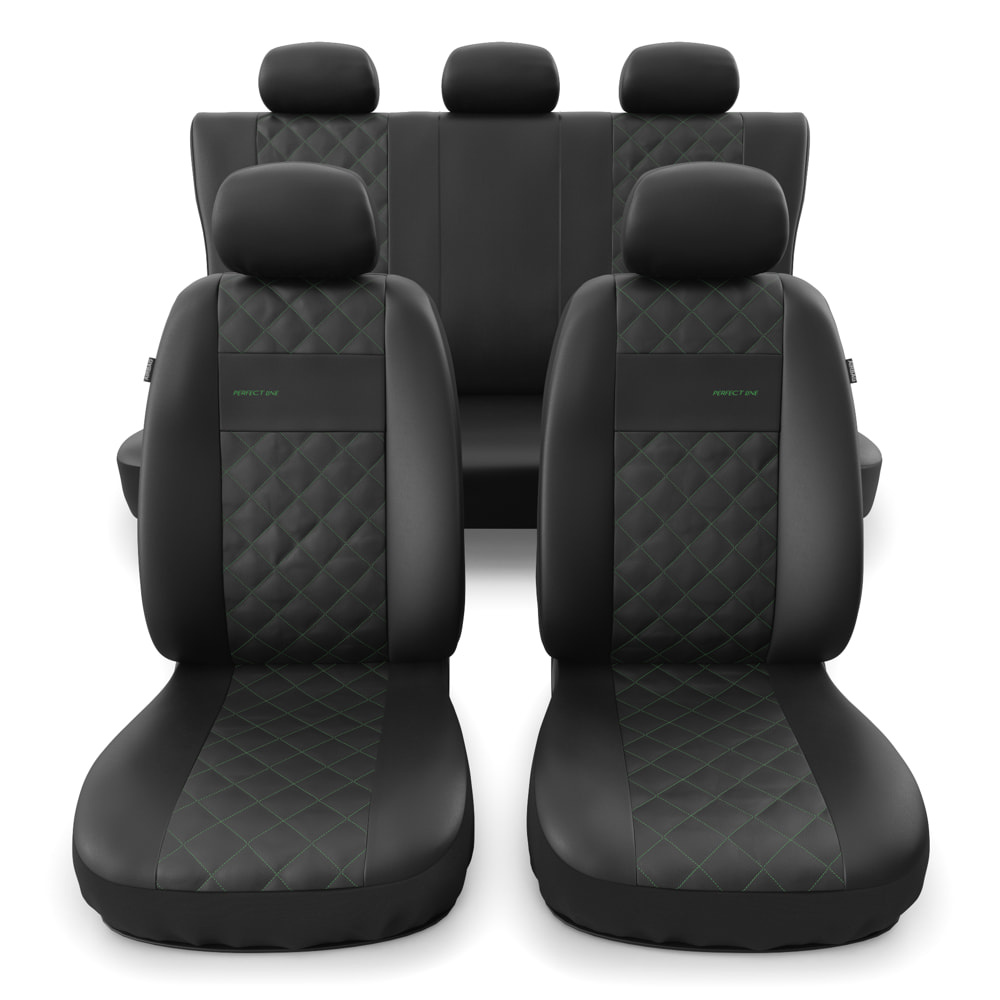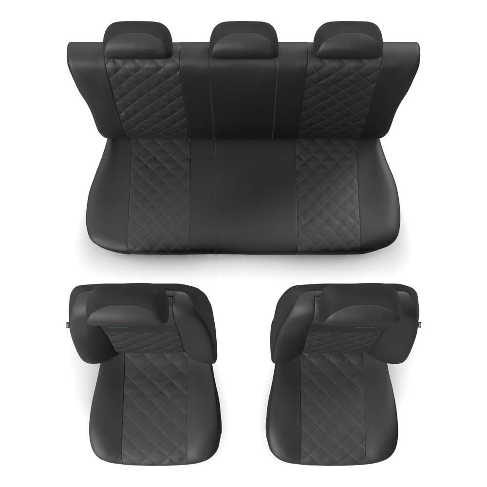 - Les housses sont en similicuir noir résistant et antitache, avec un matelassage décoratif au centre vert. Les housses avant sont également ornées de broderies.