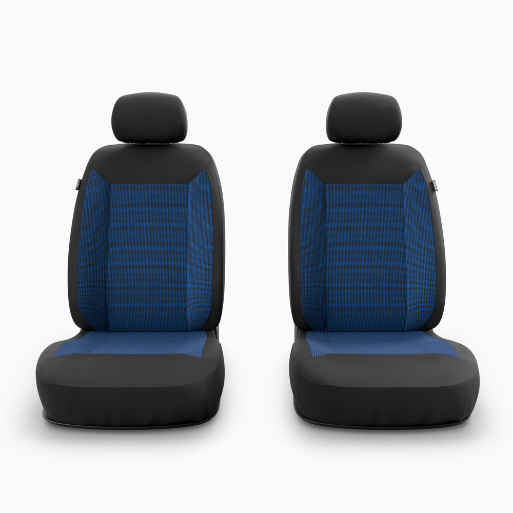 - Les housses sont en tissu de tapisserie noir avec un empiècement jacquard bleu au centre.