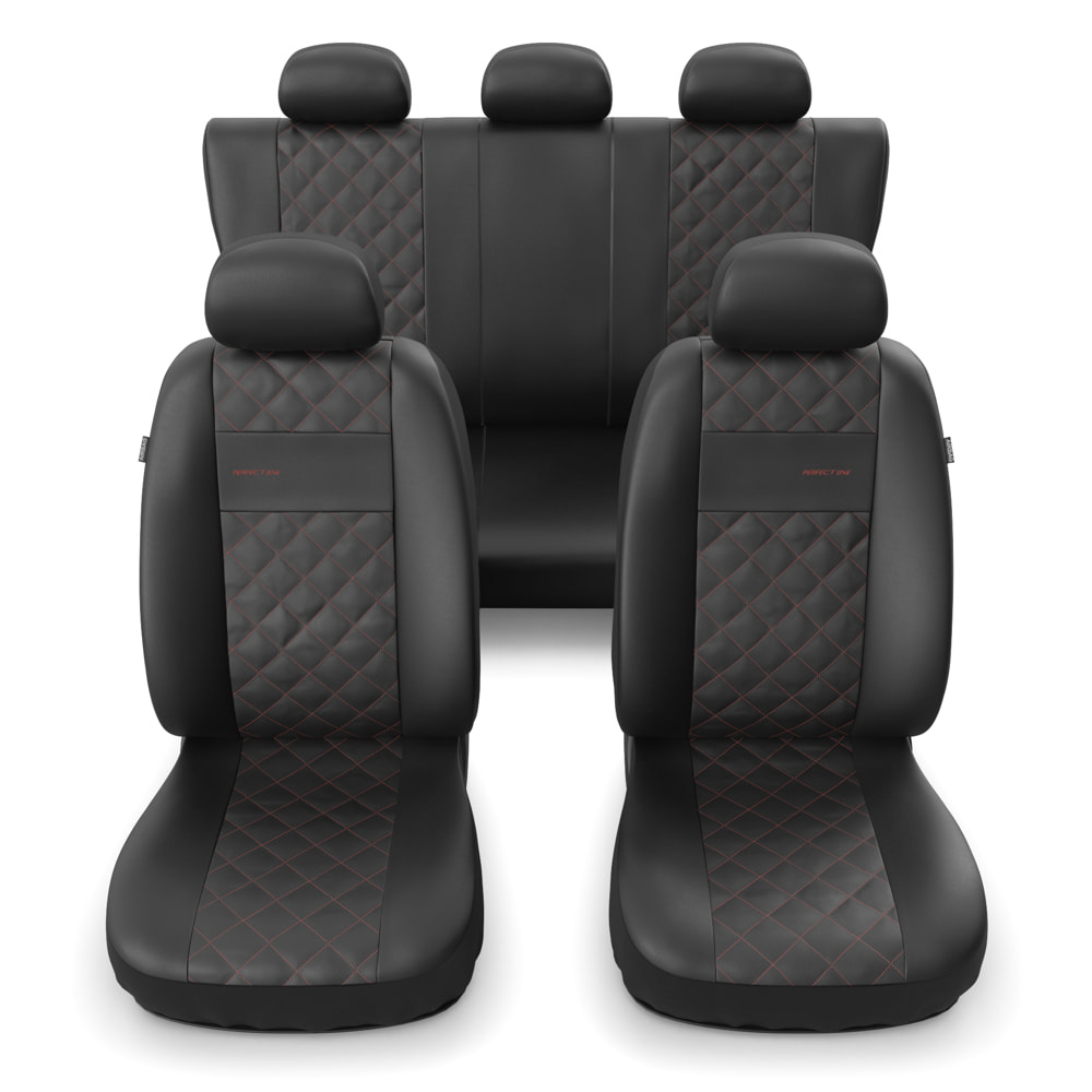 - Les housses sont en similicuir noir résistant et antitache, avec un matelassage décoratif au centre rouge. Les housses avant sont également ornées de broderies.