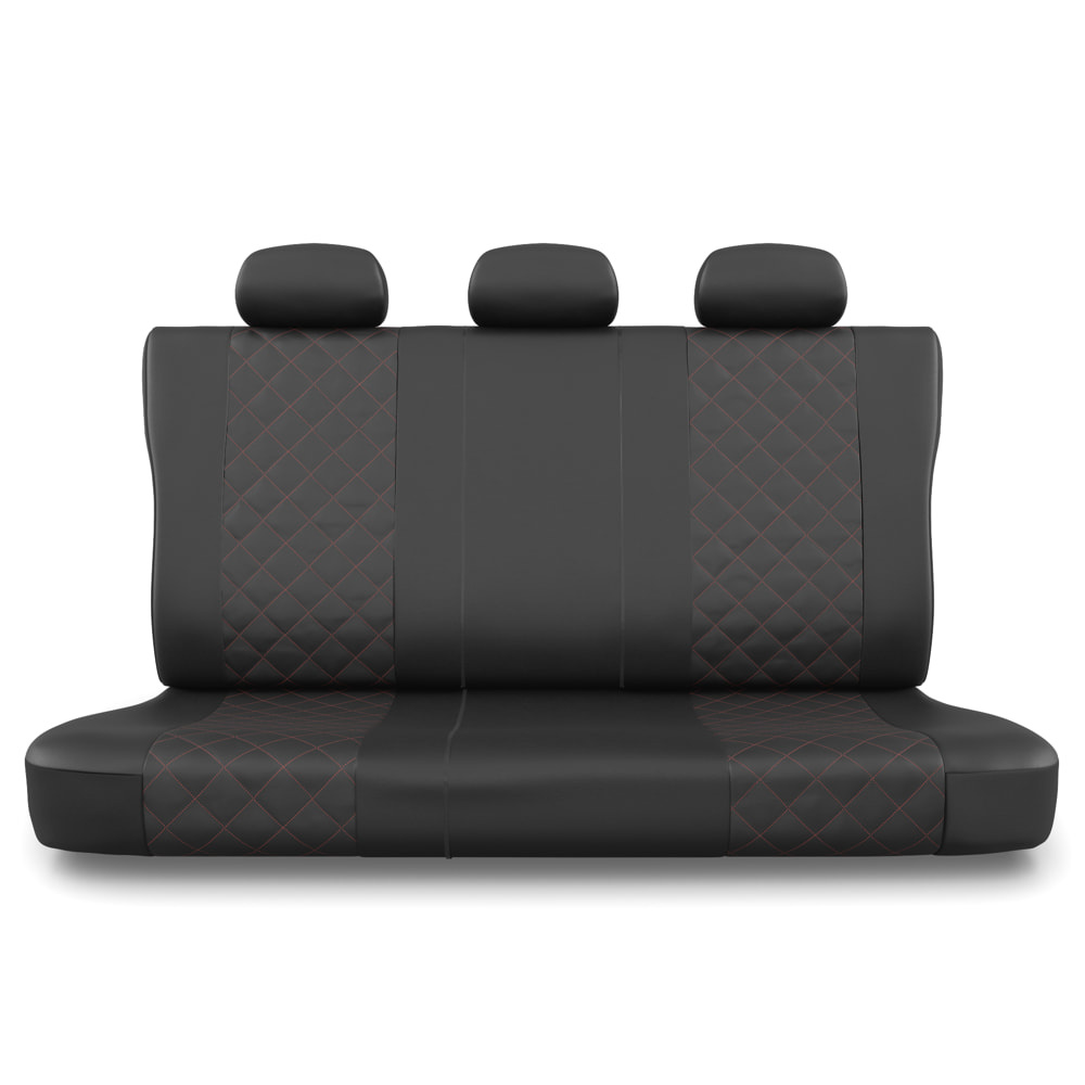 - Les housses sont en similicuir noir résistant et antitache, avec un matelassage décoratif au centre rouge. Les housses avant sont également ornées de broderies.