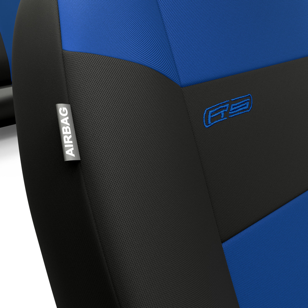 - Les housses sont en tissu de tapisserie noir, avec une partie centrale en maille bleu. Elles arborent également une broderie sportive sur le devant.