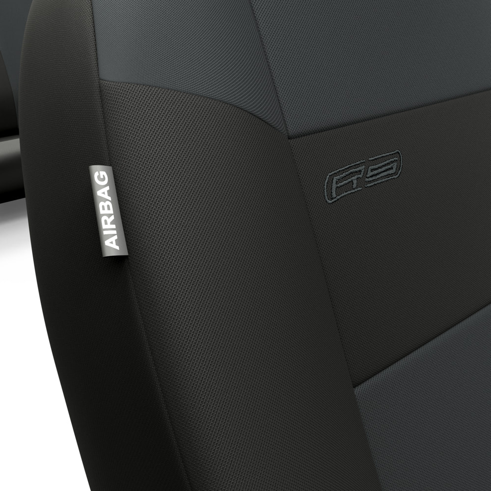 - Les housses sont en tissu de tapisserie noir, avec une partie centrale en maille gris foncé. Elles arborent également une broderie sportive sur le devant.