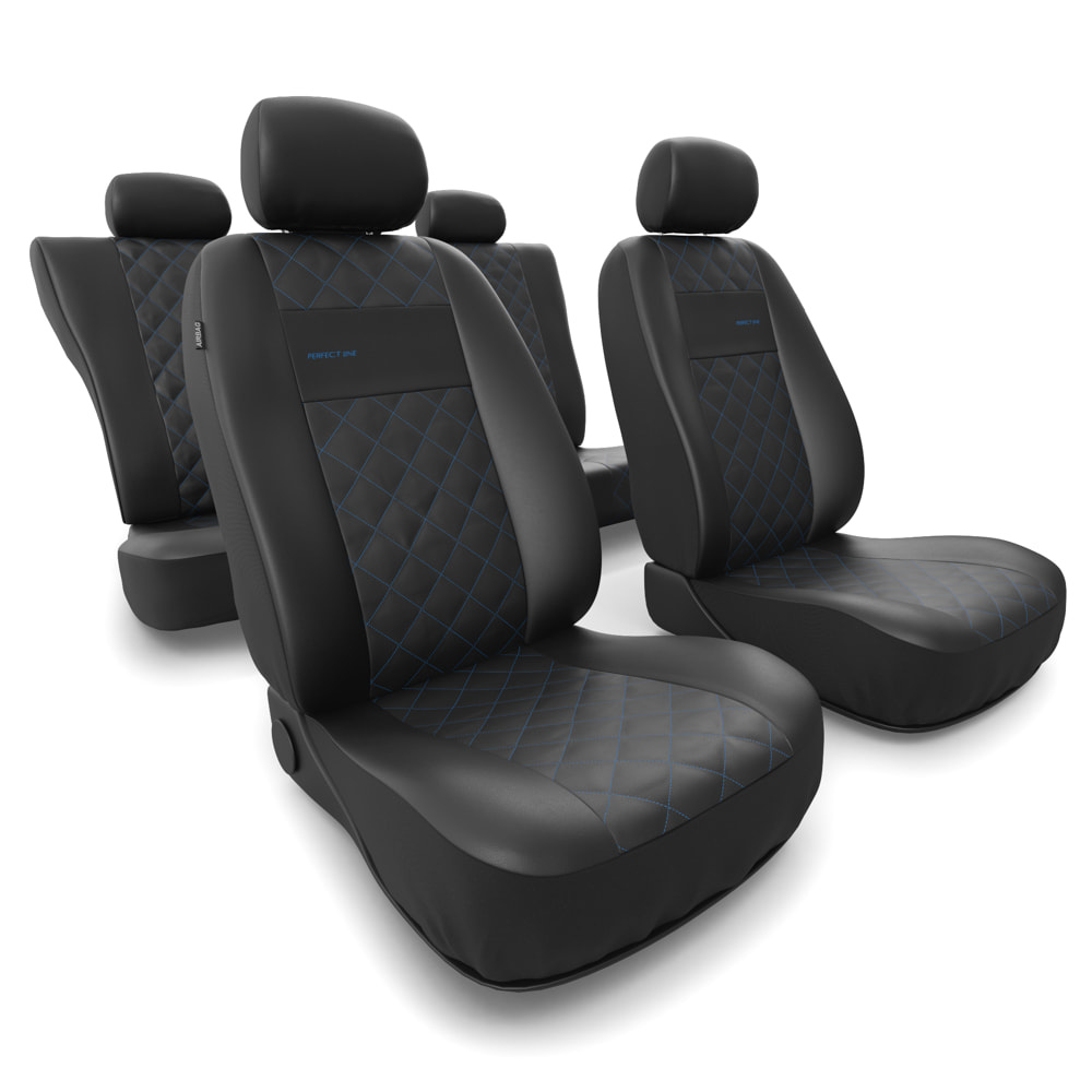 - Les housses sont en similicuir noir résistant et antitache, avec un matelassage décoratif au centre bleu. Les housses avant sont également ornées de broderies.
