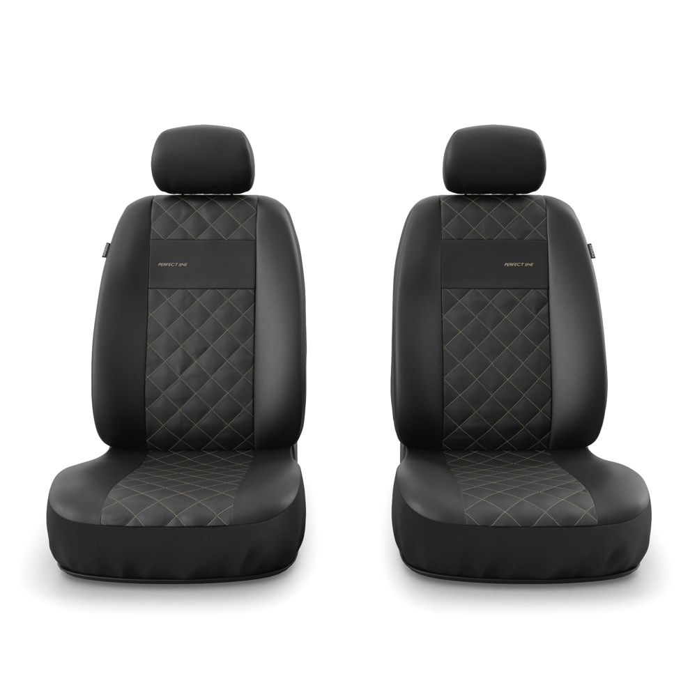 - Les housses sont en similicuir noir résistant et antitache, avec un matelassage décoratif au centre beige. Les housses avant sont également ornées de broderies.