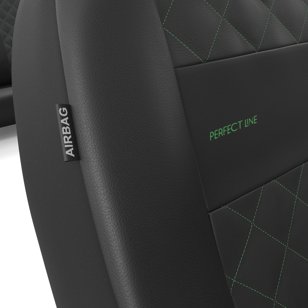 - Les housses sont en similicuir noir résistant et antitache, avec un matelassage décoratif au centre vert. Les housses avant sont également ornées de broderies.