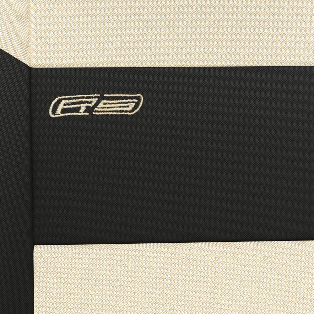 - Les housses sont en tissu de tapisserie noir, avec une partie centrale en maille beige. Elles arborent également une broderie sportive sur le devant.