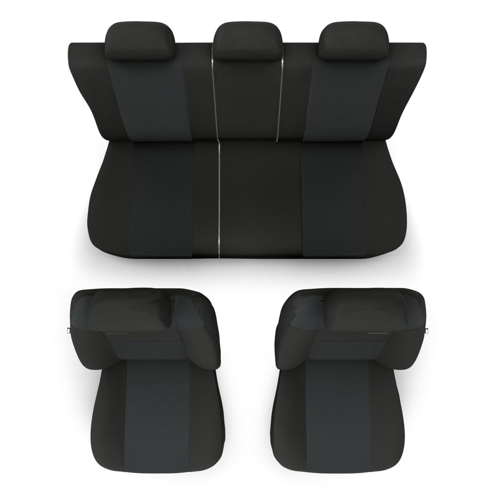 - Les housses sont en tissu de tapisserie noir, avec une partie centrale en maille gris foncé. Elles arborent également une broderie sportive sur le devant.