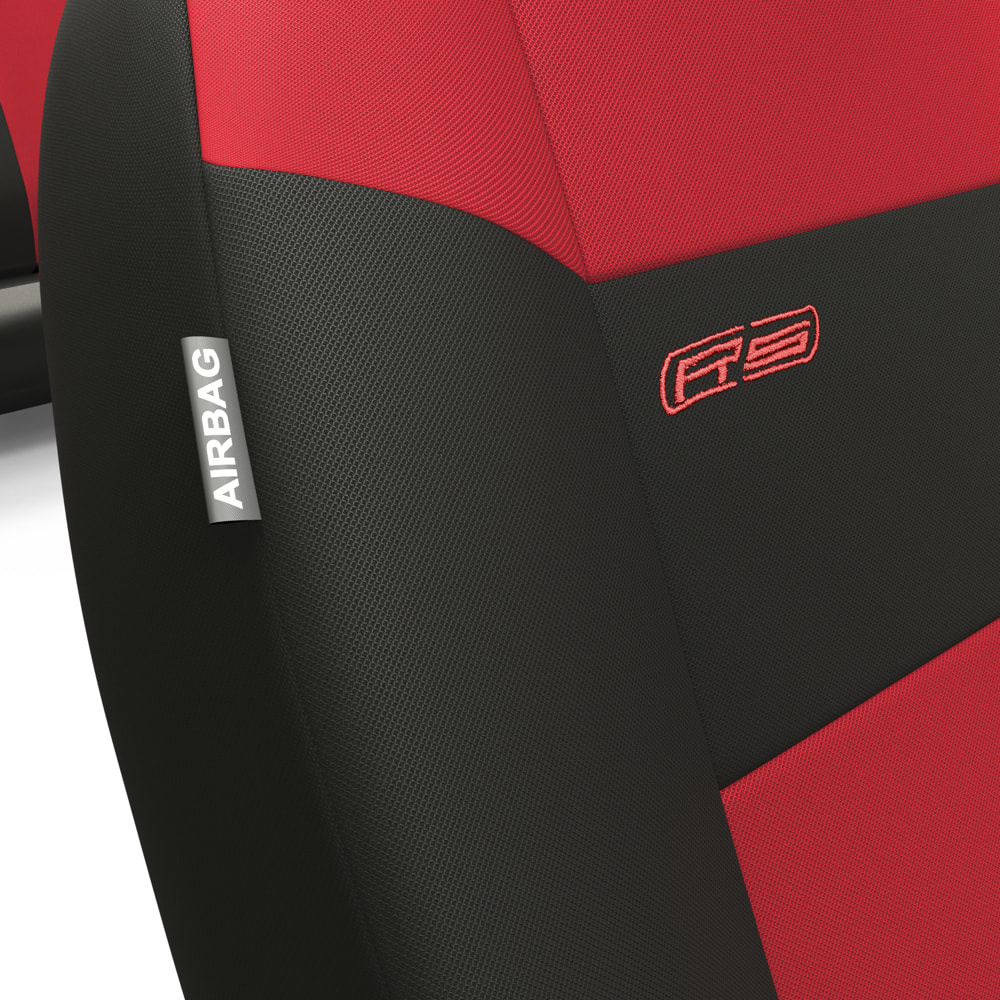 - Les housses sont en tissu de tapisserie noir, avec une partie centrale en maille rouge. Elles arborent également une broderie sportive sur le devant.