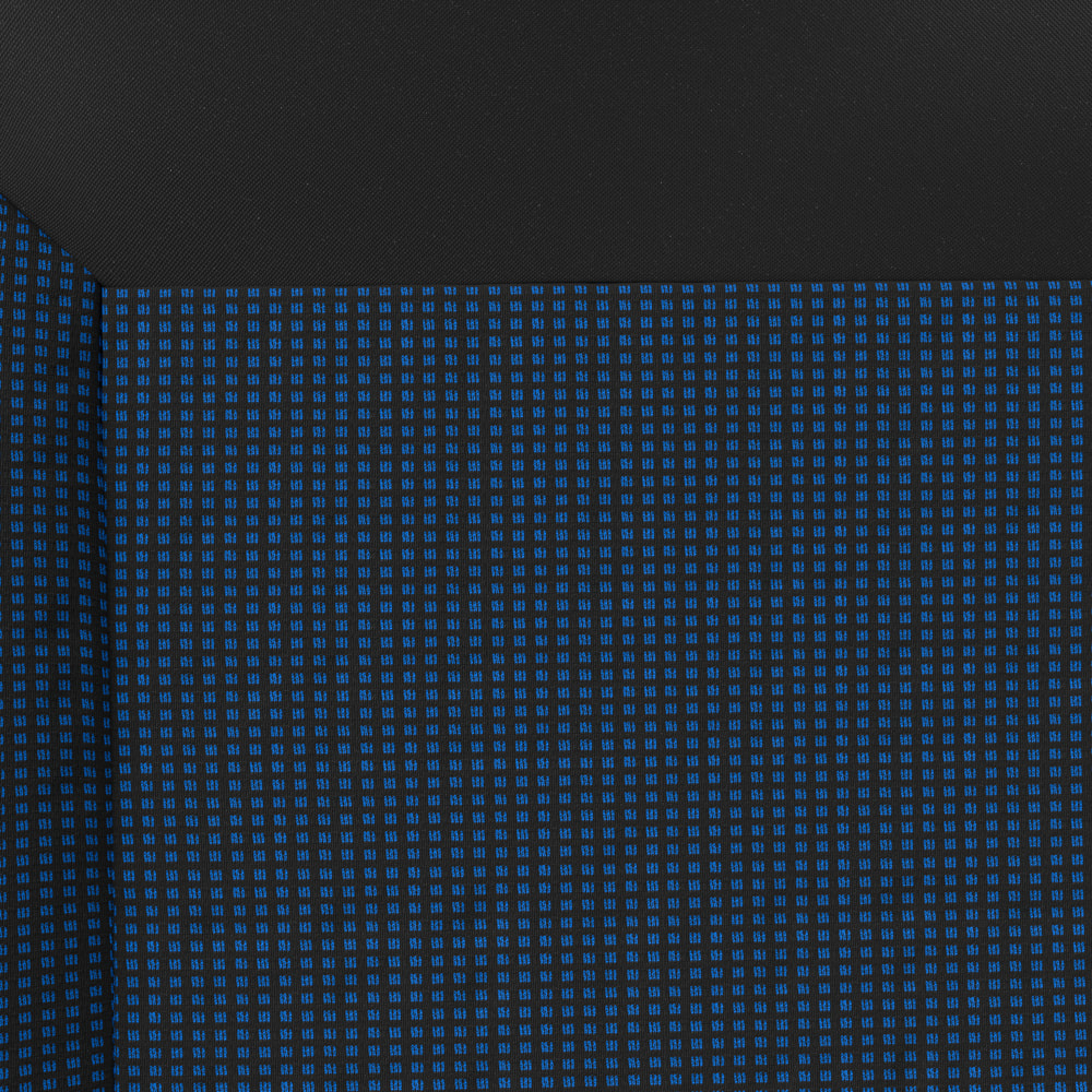 - Les housses sont en tissu de tapisserie noir avec un empiècement jacquard bleu au centre.