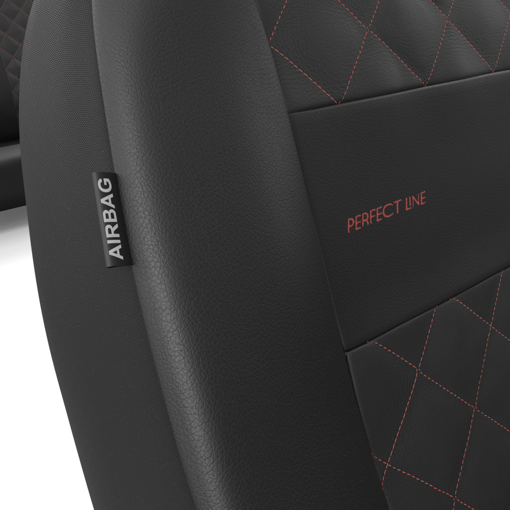 - Les housses sont en similicuir noir résistant et antitache, avec un matelassage décoratif au centre rouge. Les housses avant sont également ornées de broderies.
