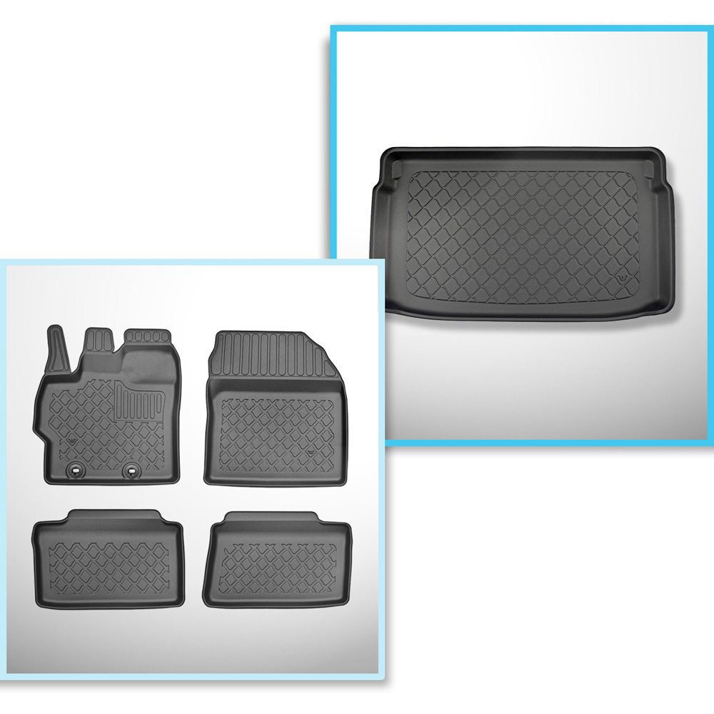 Kit tapis de coffre et tapis de voiture TPE pour: Toyota Yaris IV Hayon (11.2020-....) - coffre supérieur;pour les voitures avec double plancher de coffre;également pour les hybrides