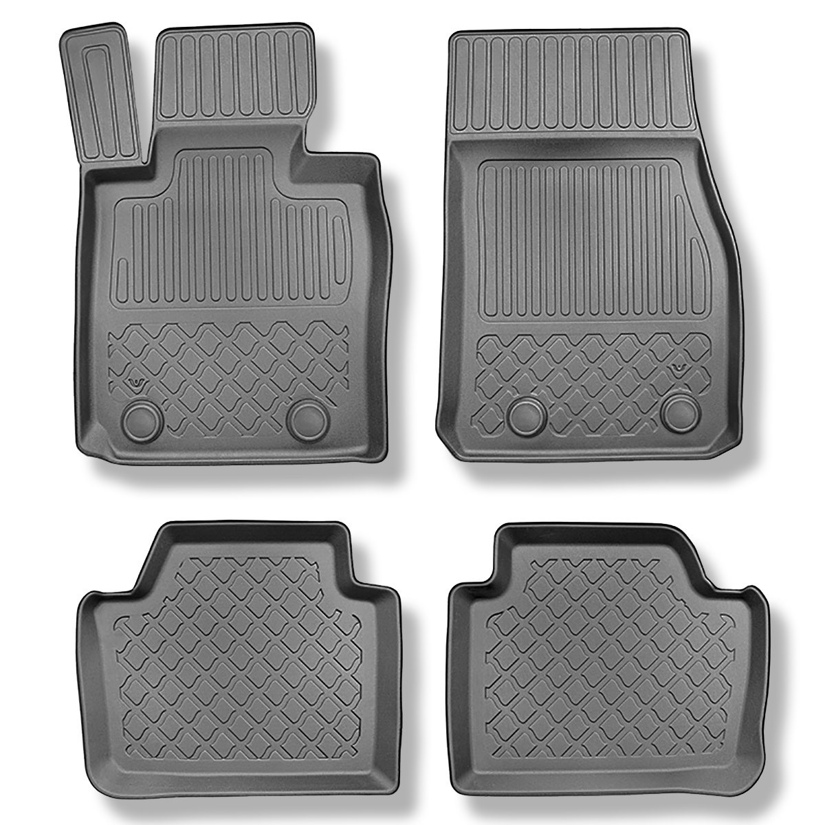 - Un ajustement parfait au sol et les fixations utilisées en fonction du modèle de voiture empêchent les tapis de bouger pendant la conduite. La production de tapis est réalisée selon les normes de qualité les plus élevées, et les matériaux utilisés pour leur production sont sans danger pour la santé et sont recyclables. Les tapis sont imperméables et faciles à nettoyer (ils peuvent être nettoyés à l'eau courante, également avec un nettoyeur haute pression).