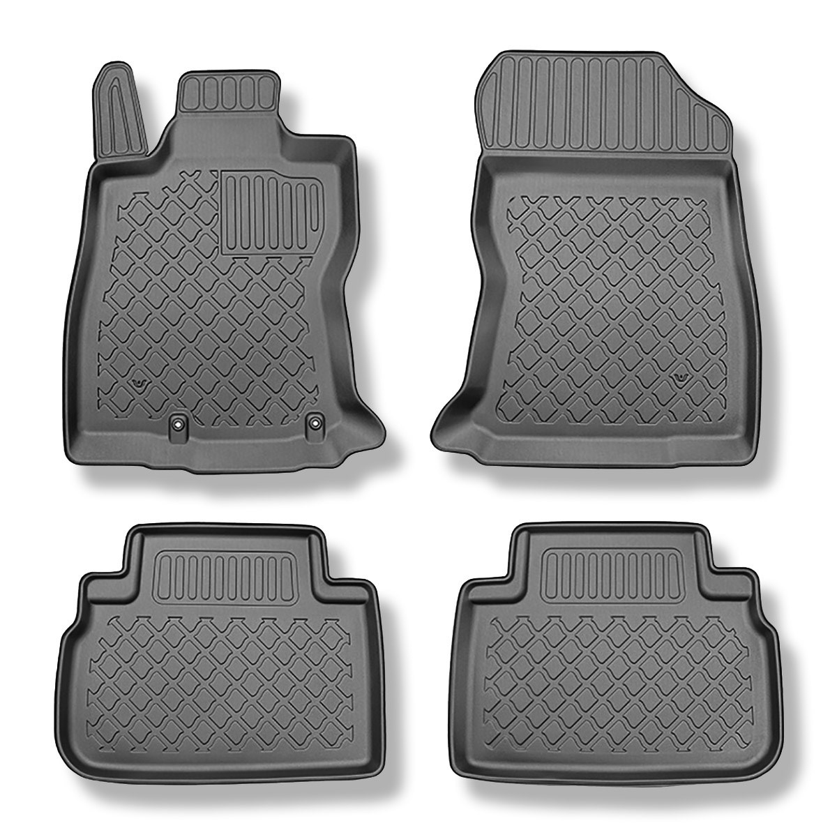 - Un ajustement parfait au sol et les fixations utilisées en fonction du modèle de voiture empêchent les tapis de bouger pendant la conduite. La production de tapis est réalisée selon les normes de qualité les plus élevées, et les matériaux utilisés pour leur production sont sans danger pour la santé et sont recyclables. Les tapis sont imperméables et faciles à nettoyer (ils peuvent être nettoyés à l'eau courante, également avec un nettoyeur haute pression).